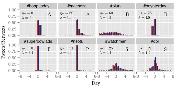 The advent of the era of Big Data has allowed many researchers to dig into various socio-technical systems, including social media platforms. In particular, these systems have provided them with certain verifiable means to look into certain aspects of human behavior. In this work, we are specifically interested in the behavior of individuals on social media platforms—how they handle the information they get, and how they share it. We look into Twitter to understand the dynamics behind the users’ posting activities—tweets and retweets—zooming in on topics that peaked in popularity. Three mechanisms are considered: endogenous stimuli, exogenous stimuli, and a mechanism that dictates the decay of interest of the population in a topic. We propose a model involving two parameters η* and λ describing the tweeting behaviour of users, which allow us to reconstruct the findings of Lehmann et al. (2012) on the temporal profiles of popular Twitter hashtags. With this model, we are able to accurately reproduce the temporal profile of user engagements on Twitter. Furthermore, we introduce an alternative in classifying the collective activities on the socio-technical system based on the model.